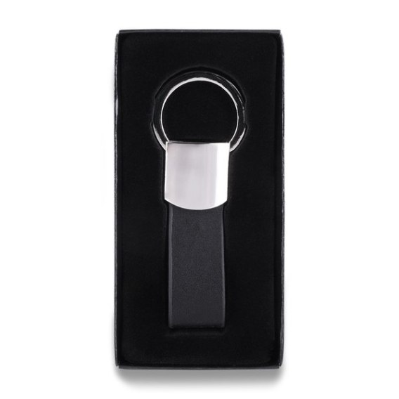 Brelok wykonany z połączenia błyszczącego metalu z ekoskórą. Pakowany w czarne opakowanie upominkowe