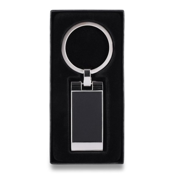 Gustowny metalowy brelok łączący czarną matową powierzchnię z błyszczącymi elementami. Pakowany w czarne pudełko upominkowe.