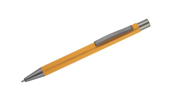 Długopis GOMA to prosty design połączony z przyjemna w dotyku gumowana powierzchnią. Całość jest utrzymana w lekkich, matowych barwach. Wykonany z aluminium. Wykończenia w kolorze grafitowym. Wkład w kolorze niebieskim.