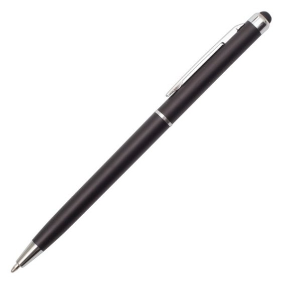 Długopis z końcówką przystosowaną do ekranów dotykowych. Korpus wykonany z plastiku, skuwka z metalu. Wkład w kolorze niebieskim. Posiada obrotowy mechanizm włączania.