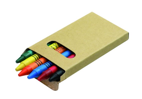 Kredki świecowe w sześciu kolorach, zapakowane w ekologiczny kartonik z okienkiem. Logo nadrukujemy na kartoniku.