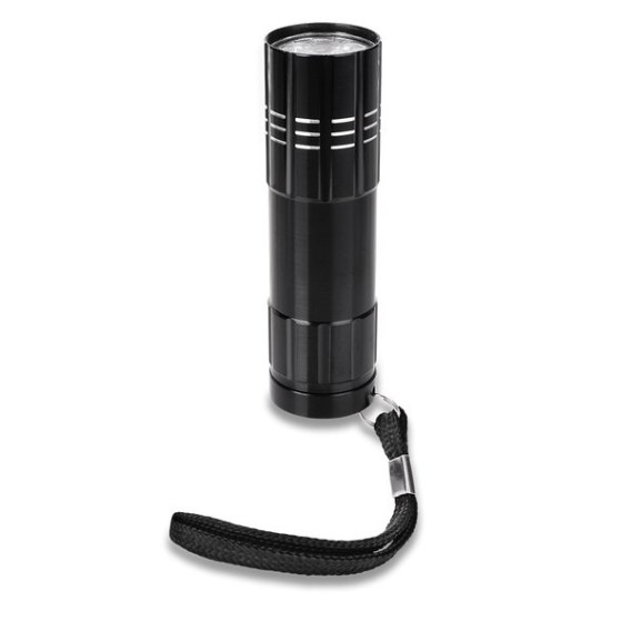 9 diodowa latarka LED wykonana z aluminium. Zasilana 3 bateriami AAA (dołączone).