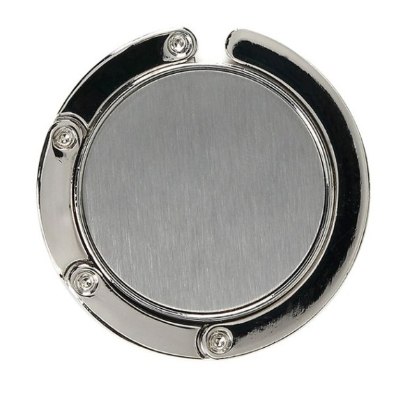 Wieszak na torbę z serii ROSE HILL wykonany z stopu cynku, płyta ze stali nierdzewnej, spód: czarna guma.