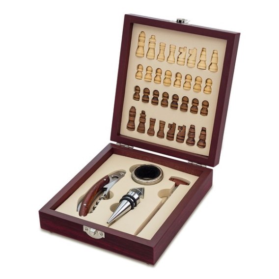 Oryginalny zestaw składający się z szachów oraz akcesoriów do wina. Wykonany z metalu i MDF. Figury szachowe wykonane są z plastiku. Na akcesoria do wina składają się: nóż kelnerski, okapnik, zatyczka oraz termometr.